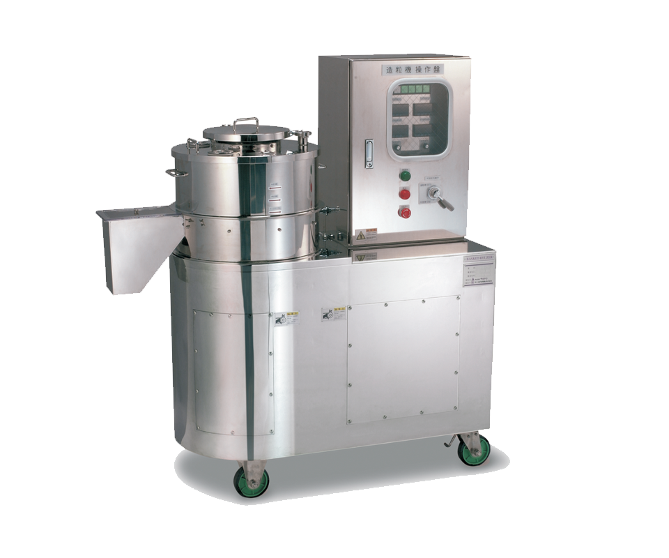 Single rotor and mixing blade are provided in the chamber horizontally. After dry mixing, the liquid shall be added to form wet mass which is then disintegrated into fine granules by the pins on the rotor rotating at high speed.