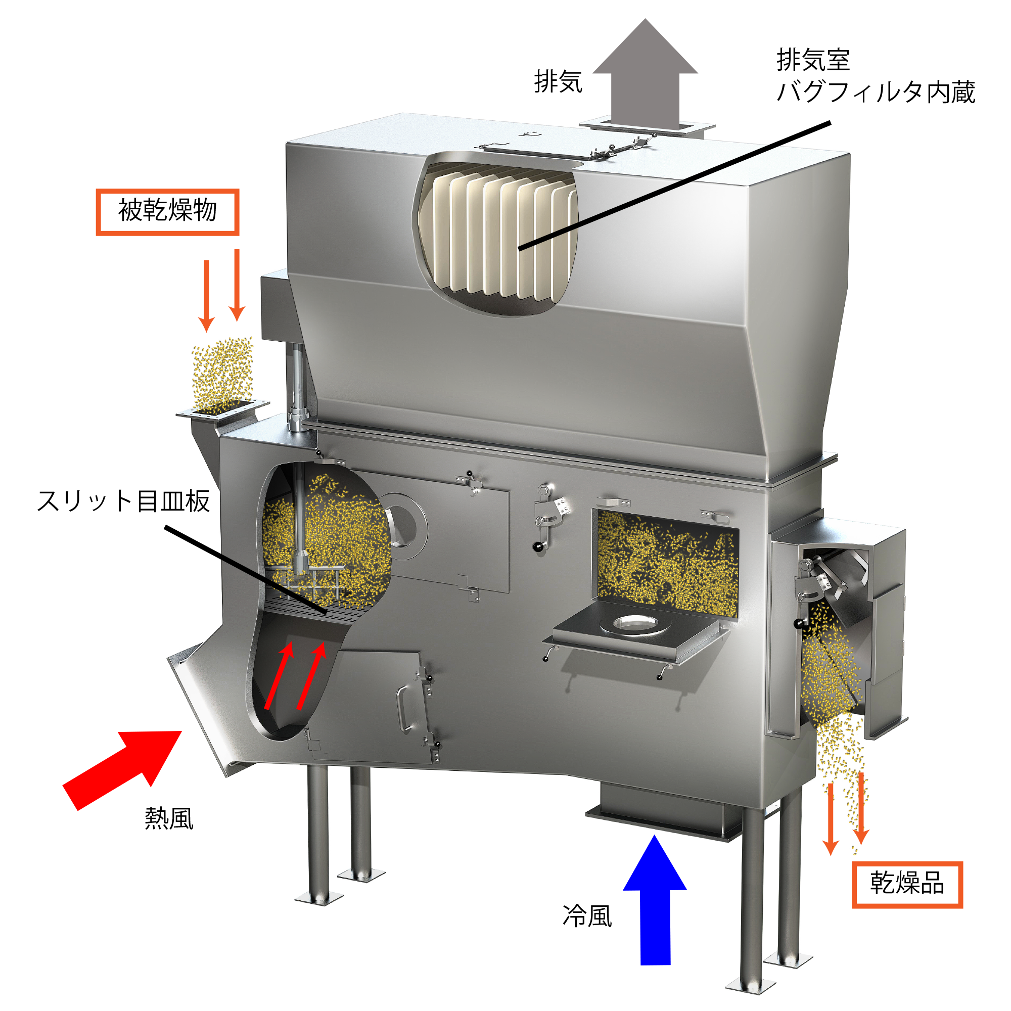 長方形の流動室になっており、被乾燥物は流動室の一端から連続で投入され横方向に浮遊流動しながら順次出口より排出されます。被乾燥物の移動速度、流動状態など操作条件を調節したり、適宜な仕切板を入れることもできます。流動床面積は0.5~18㎡まで段階的に標準化されています。乾燥後の冷却は、乾燥室の後に冷却室を設けることにより乾燥と冷却を連続して行うことができます。連続型でしばしば問題となります材料の大塊(ダマ)は、大川原製作所独自開発の方向性をもつスリット目皿板で、比較的スムーズに排出することができます。